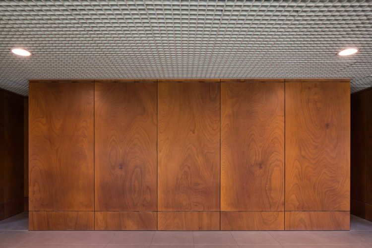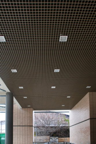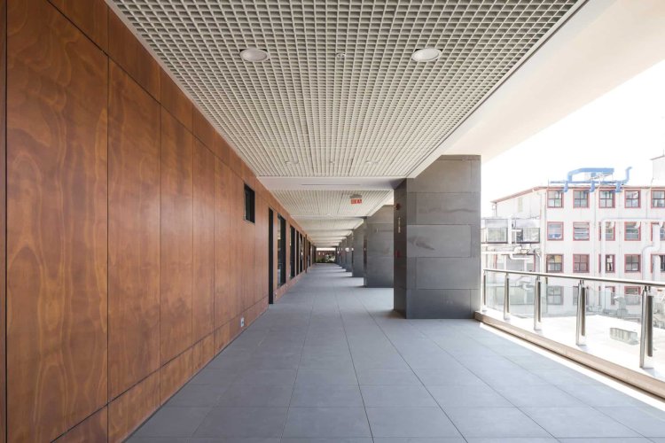 Cielo metálico abierto y transparente formado por perfiles en forma de U.