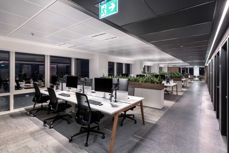 Las bandejas de malla estriada en perfiles T mejoran el patrón del diseño modular.