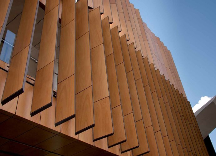 NATURCLAD-W puede instalarse como fachada ventilada a modo de celosía o lama solapada, en falsos techos y en paredes curvas.